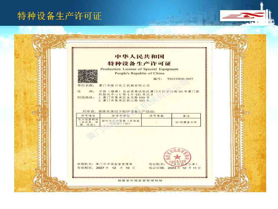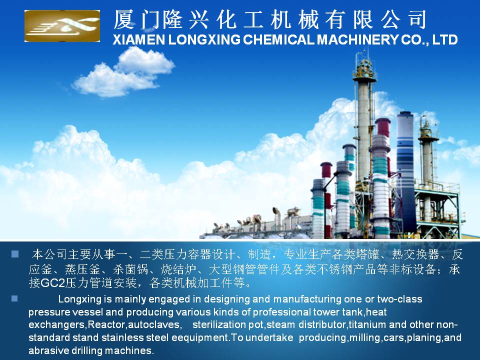 廈門隆興化工機械有限公司成立于2001年5月,占地面積30000平方米,擁有生產車間面積10000平方米及相關配套的辦公場所3000平方米,其中下料場所1000平方米,不銹鋼制作場所2000平方米,ASME產品制作區域1200平方米,無損曝光室30平方米。公司有職工135人,擁有專業的技術人員和管理人員36人。公司主要從事設計、制造A2級覆蓋D類壓力容器...